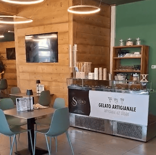 L’interno del locale è moderno e luminoso, con ampie vetrate che lasciano entrare la luce naturale. Le pareti in legno chiaro donano calore e accoglienza, creando un’atmosfera rilassata e conviviale. Gli arredi dal design essenziale, abbinati a tonalità neutre e dettagli curati, rendono lo spazio armonioso e invitante, perfetto per una pausa caffè, un gelato artigianale o un pranzo veloce.