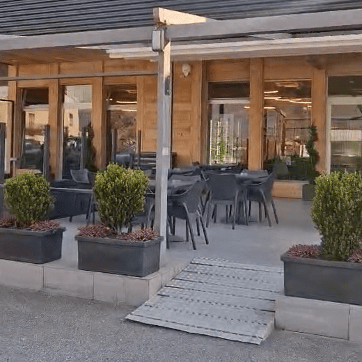 All’esterno, il locale accoglie gli ospiti con un ampio dehor arredato con tavoli eleganti e sedute comode, ideale per gustare un caffè o un gelato all’aria aperta. La copertura leggera protegge dal sole nelle giornate più calde, mentre la vista mozzafiato sulle Alpi regala un’atmosfera unica, perfetta per momenti di relax tra natura e gusto.